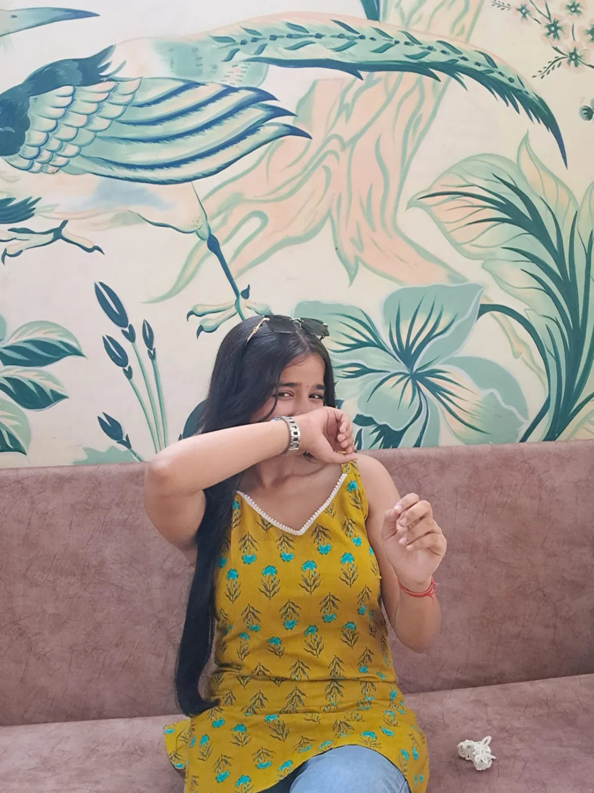 - Design: Mustard yellow base with turquoise floral prints